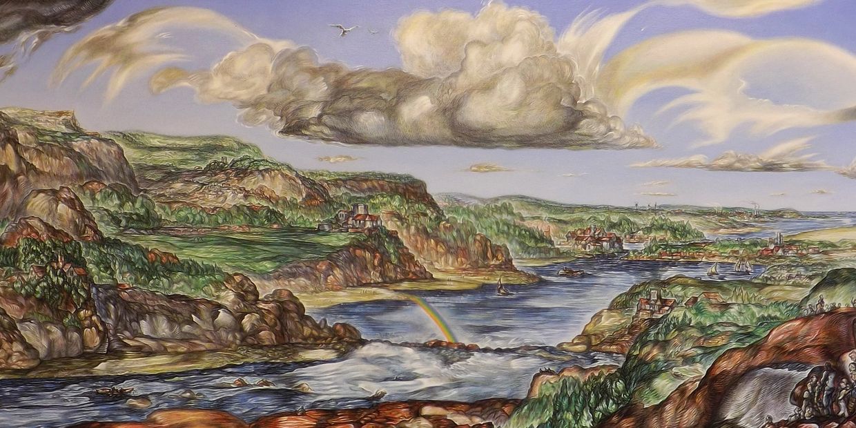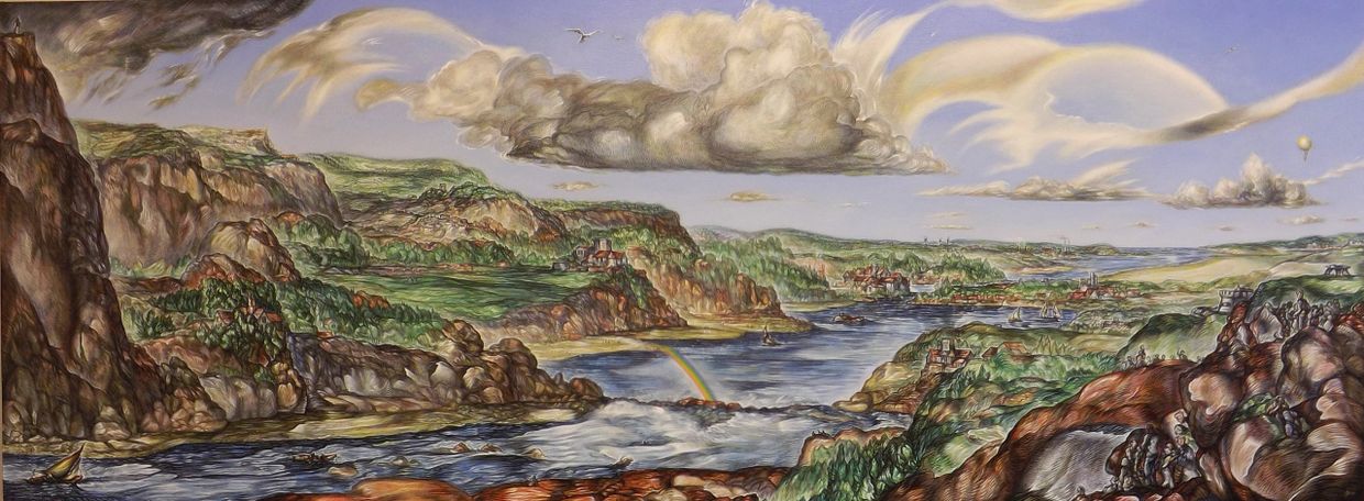 DESCRIPTION:    A panoramic view of a river as it emerges in rapids between bluffs, over a waterfall with rainbow, and then flows onward towards the sea. Everywhere there are details of interest: people, buildings, ancient monuments, castles, shipping, etc, shown in minute form.