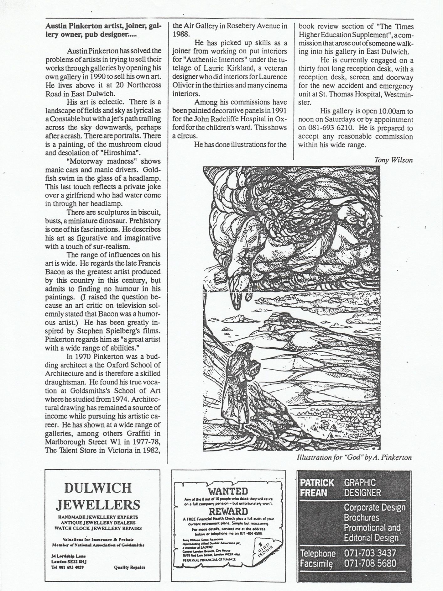 At the time when I was running my strange little gallery of my own work a few hours a week in Northcross Road, East Dulwich, South London,  the 'Austen Pinkerton Gallery'  ( I still have the signboard over the shop which I made myself) a local journalist, Tony Wilson, came into the gallery one day , and after conducting an 'interview' with me of sorts, later produced an article about myself and the gallery for a local Dulwich newspaper, and dropped by to show it to me. I reproduce a facsimile of the article, which included a reproduction of one of my illustrations for the Times Higher Educational Supplement: 'God and Moses'