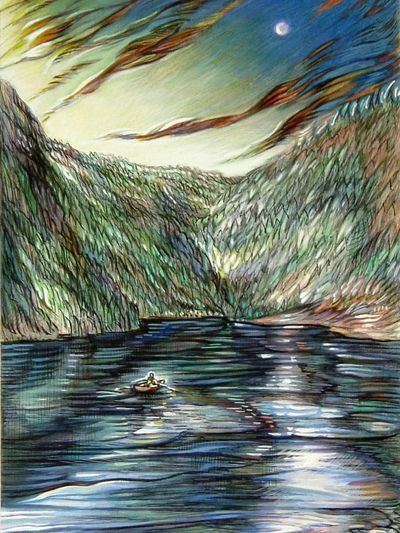 The inky waters reflect the pearly light of the moon, and in that light, we can see a lone boatman rowing in the lake. The lonely figure intensifies the feeling of desolation and isolation that a viewer would experience if directly present in the scene. Marion Boddy-Evans (About.com Painting) writes about the intense emotion created in the viewer which is equal to the emotion felt by the artist who witnessed the scene. The glowing pine forests, reflecting the dying light of the sun, and the darkening sky have been realistically caught in the picture. Here the deepening night sky reflects its gloomy darkness in the water, which is calm and placid. Using a variety of blue and green tones, the late hour of the evening has been depicted, to show the deepening dusk-time.